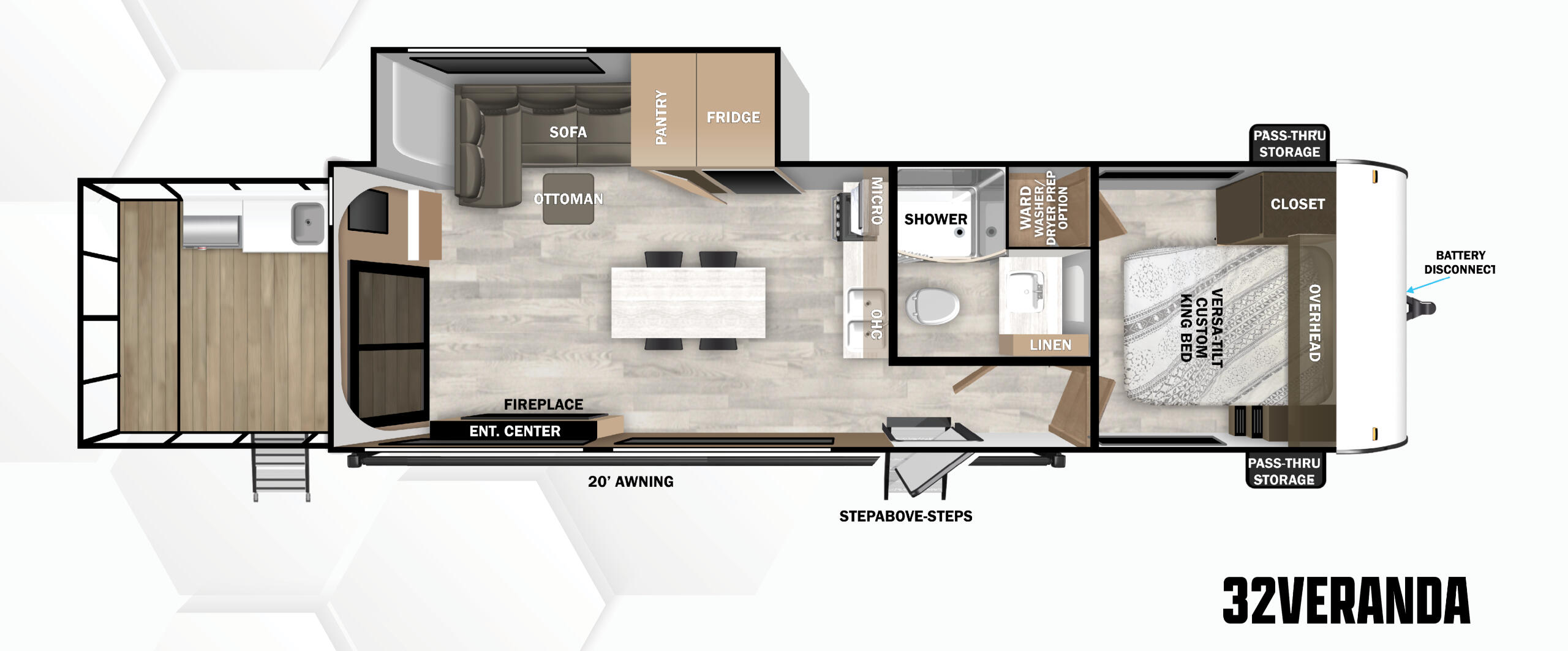Designed for those who crave comfort on the go, the 32VERANDA offers ample room and top-notch amenities for an unparalleled travel experience. Elevate your journeys with the Forest River 32VERANDA and make ever trip unforgettable.
